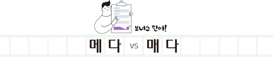 ‘메다’와 ‘매다’는 정말 우리가 쉽게 헷갈리는 단어 중 하나입니다. ‘메다’는 어깨에 걸치거나 올려놓다라는 뜻과 어떤 책임을 지거나 임무를 맡다라는 뜻이 있습니다. 그리고 ‘매다’는 끈이나 줄 따위의 두 끝을 엇걸고 잡아당기어 풀어지지 않게 마디를 만드는 것을 뜻해요. 헷갈리지 않으려면 메다는 ‘멜빵’을 떠올려 보세요. 멜빵은 어깨에 걸쳐서 메는 것이잖아요. 또한 매듭은 넥타이를 매거나, 신발 끈을 매거나 할 때를 떠올리면 이해가 쉽습니다.