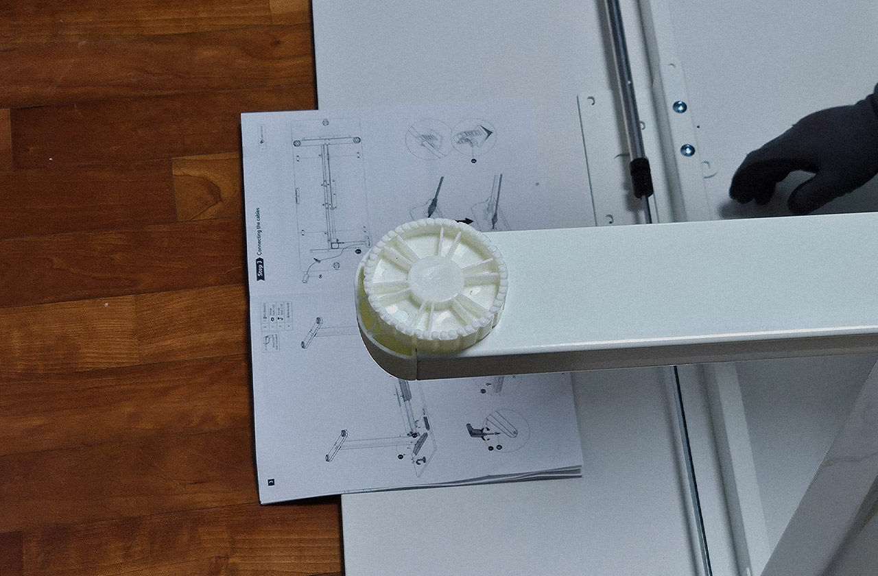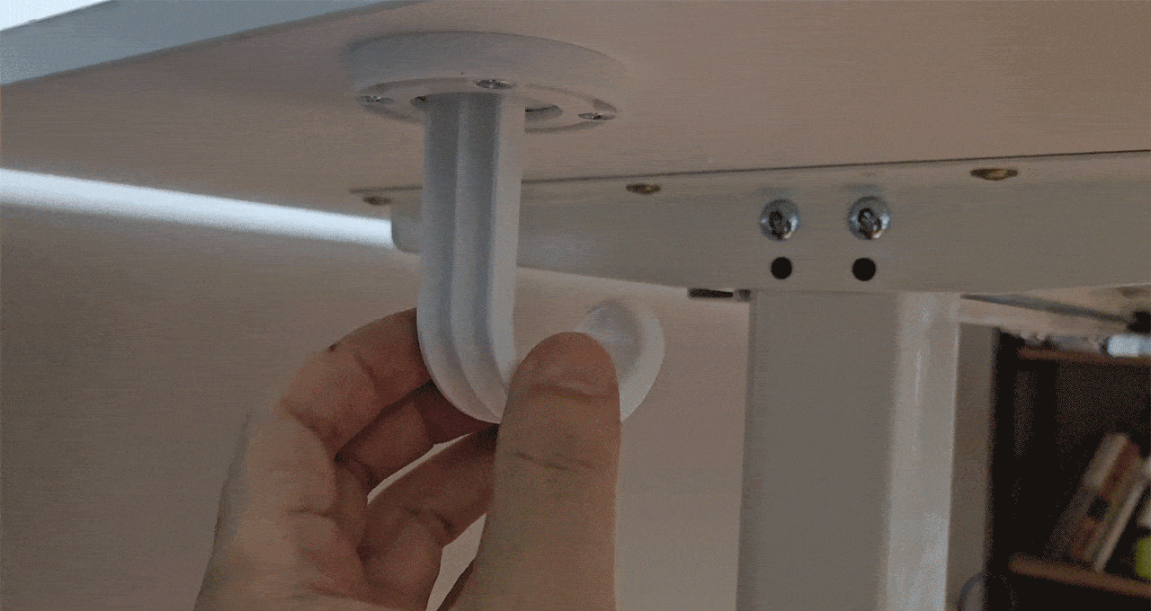 가벼운 상판은 기존에 사용하던 두꺼운 책상 대비 많은 흔들림이 있어요. 흔들림은 높이가 높아질수록 더욱 심합니다. 매뉴얼에 따르면 상하 조절이 되기 때문에 벽에 밀착하지 않도록 가이드하고 있습니다. 이로 인해 책상에 기대는 경우 가볍기에 책상이 밀리거나 흔들린다는 단점이 있어요. 단점을 보완하려면 바닥면에 고무 패드같은 걸 까시는 걸 추천합니다!