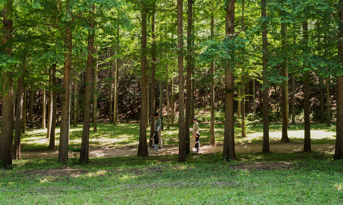 주차장을 지나 작은 나무숲을 지나오면 곧게 뻗은 메타세쿼이아 숲길이 드러난다. 숲 가운데로 산책길이 잘 나 있어서 오며 가며 산책하는 여행객들을 심심찮게 마주하게 된다. 메인 산책로가 아니더라도 곧게 뻗은 나무들 사이 샛길로 걷는 재미가 있다. 온통 그늘이라 시원하기도 하고, 걷다가 지칠 때는 쉴 수 있도록 중간마다 벤치도 마련되어 있다.