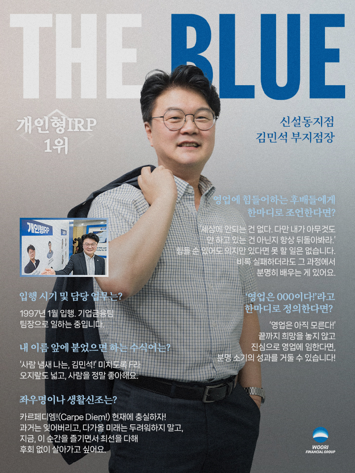 은행원으로 살아갈 날이 이제 많이 남지 않았다고 생각하니 기분이 묘하네요. 바람이 있다면 저를 알고 있는 모든 선후배에게 부끄럽지 않은 은행원으로 기억되고 싶습니다. 어느 자리에 있던지 제가 할 수 있는 마지막 소임을 다하려고요. 우리은행이 고객들에게는 사랑받는 은행, 직원들에게는 행복한 직장이 될 수 있도록요.