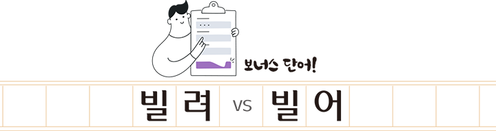 “이 자리를 빌려 감사하다는 말씀 전하고 싶습니다”라는 말을 쓸 때 늘 헷갈리는 단어가 있어요. 바로 ‘빌려’와 ‘빌어’입니다. 정말 자주 쓰는 말인데도 쓸 때마다 아리송해지더라고요. 이렇게 생각해 볼까요? ‘빌다’는 바라는 바를 이루게 해달라고 간청할 때, 잘못을 용서해달라고 호소할 때 쓰는 말, ‘빌리다’는 물건이나 돈을 도로 돌려주거나 대가를 갚기로 하고 얼마 동안 쓸 때, 남의 말이나 글 따위를 취하여 따를 때, 어떤 일을 하기 위해 기회를 이용할 때 등에 쓰는 말입니다. 사전적 정의만 제대로 안다면 그리 어려운 말은 아니죠?