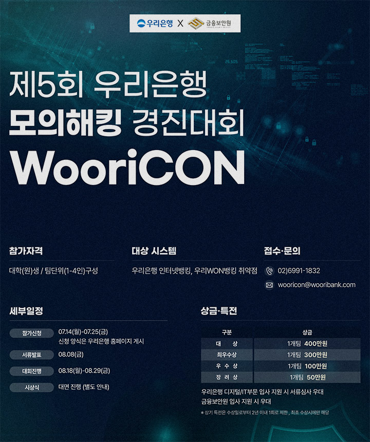 우리은행은 금융보안원과 공동으로 ‘제5회 WooriCON 모의해킹 경진대회’를 개최한다고 지난 7월 14일 밝혔다. 본 대회는 8월 18일(월)부터 8월 29일(금)까지 진행되며, 우리은행 인터넷뱅킹과 우리WON뱅킹의 보안 취약점을 찾아 제거하는 ‘버그 바운티(Bug Bounty, 보안 취약점 신고포상제)’ 형식으로 운영된다. 우리은행은 대회에 참여한 팀의 보안 취약점 발굴 수준과 창의성 등을 종합 평가해 대상 1팀, 최우수상 1팀, 우수상 1팀, 장려상 1팀 등 4팀을 선정, 총 850만원의 상금을 수여한다. 아울러, 수상자에게는 우리은행 및 금융보안원 입사 지원 시 서류심사 우대 혜택이 제공된다.