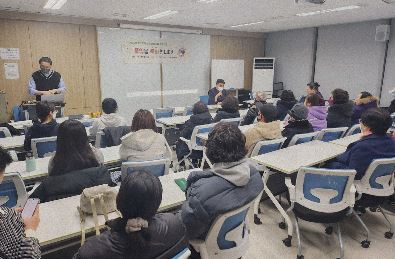 동현 야학이 국가보조금을 일부 받기도 하지만, 예산 대부분은 졸업생, 졸업교사 등 후원자분들의 도움으로 운영하고 있어요. 그래서 재정적으로 어려운 부분이 있습니다. 지금 교실도 장마철엔 곰팡이가 생기기도 하고, 겨울에는 너무 추워요. 좋은 환경을 학생들에게 제공하지 못해 늘 미안한 마음입니다. 특히 코로나19 때 수업 진행이 정말 어려웠어요. 대부분이 고령인만큼 정부의 집합 관련해 여러 가지 수칙을 지킨다고 하더라도, 지하의 작은방에 여럿이 모이는 것 자체가 정말 부담스러웠죠. 코로나19가 심해질 때는 휴교를 하고 우편으로 공부 자료를 보내주기도 했었습니다. 다행히 학생분들 중 코로나19로 심하게 아프셨던 분들은 없어서 어려웠던 시기를 잘 버텨낸 것 같습니다.