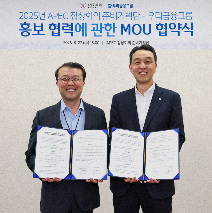 우리금융그룹은 지난 8월 27일 APEC 정상회의 준비기획단과 ‘2025년 APEC 정상회의’(이하 ‘APEC 2025 KOREA’) 공식 홍보 협력을 위한 MOU를 체결했다. 협약식에는 김지준 APEC 정상회의 준비기획단 기획실장과 이정섭 우리금융지주 브랜드부문장을 비롯한 양 기관 관계자들이 참석해, ‘APEC 2025 KOREA’의 성공적인 개최를 위한 홍보 협력을 다짐했다. 이번 MOU를 통해 우리금융그룹은 금융기관 중 유일하게 APEC 정상회의 준비기획단과 함께 국내외 홍보 활동을 공동으로 추진한다. ‘우리나라’와 ‘우리금융그룹’이 ‘APEC 2025 KOREA’와 함께한다는 메시지를 전달하며 국가적 행사의 성공적인 개최에 힘을 보탤 예정이다.