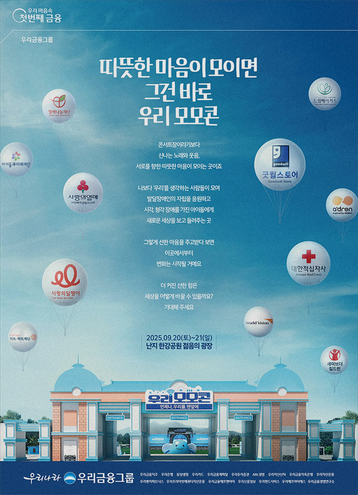 우리금융그룹이 오는 9월 20일부터 21일까지 양일간 서울 난지한강공원 젊음의 광장에서 ‘모이면 모일수록 선한 힘이 커지는 콘서트, 우리 모모콘’(이하 ‘모모콘’)을 개최한다. 올해로 3회째인 ‘모모콘’은 ‘언제나.우리를.맨앞에’라는 그룹 슬로건 아래, 음악과 함께 사회공헌을 실천하는 국내의 대표적인 참여형 사회공헌 콘서트다. 이번 ‘모모콘’에서는 △YB(윤도현밴드)(20일) △god(21일) △WOODS(21일) △잔나비(21일) △다이나믹듀오(21일) △에픽하이(20일) △윤하(20일) △마크툽(20일) 등 대중에게 사랑받는 뮤지션들이 무대에 오른다. 이와 더불어 ‘우리다문화어린이합창단’의 공연도 마련돼 ‘우리’의 의미를 더한다. ‘모모콘’현장에서는 기부문화 확산을 위한 ‘함께터치’태깅 이벤트가 진행된다. 관객이 현장 부스를 방문하여 ‘함께터치’ 횟수를 쌓으면 우리금융그룹이 이에 상응하는 기부금을 모아 사회공헌 사업을 추진한다. 또한 ‘함께터치’에 동참한 관객들은 참여 횟수에 따라 물과 간식, 의자, 손선풍기 등의 굿즈를 교환할 수 있다.