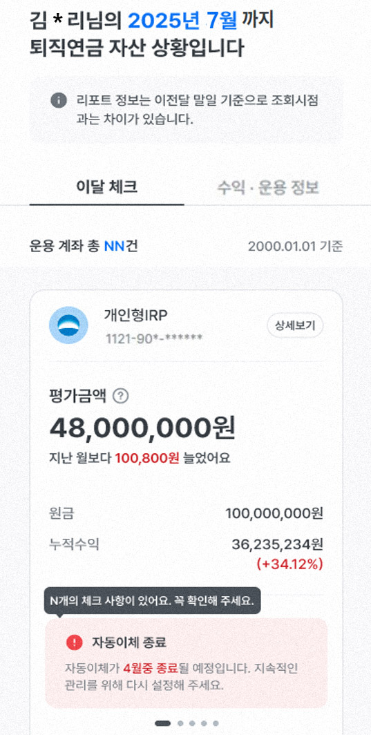 우리은행이 고객의 효율적인 퇴직연금 자산관리를 위해 카카오 알림톡을 활용한 스마트 안내장 서비스 ‘우리 연금레터’를 시행한다고 지난 8월 11일 밝혔다. 스마트 안내장 서비스를 통해 제공되는 ‘우리 연금레터’는 우리WON뱅킹 앱 설치 없이도 생년월일을 입력하는 간편한 인증절차만으로 고객의 퇴직연금 자산 현황을 카카오 알림톡으로 편리하게 확인할 수 있는 서비스로 이달 체크와 수익·운용 정보로 구성되어 있다. 먼저 ‘이달 체크’에서는 △자동이체 △상품 만기 △입금예정상품 안내 △현금성자산 운용 △디폴트옵션 안내 등 5종의 고객 맞춤형 알림과 월별 거래 이력이 요약된 자료를 제공해 준다. 특히, 고객별 알림은 우리WON뱅킹과 연동되어 자동이체 연장, 운용상품 만기 예약, 보유 상품 변경 등을 간편하게 처리할 수 있다. 또한, ‘수익·운용 정보’에서는 △수익률 변동 추이 △자산 운용현황 등 고객의 연금 자산을 그래프를 통해 직관적으로 보여준다.