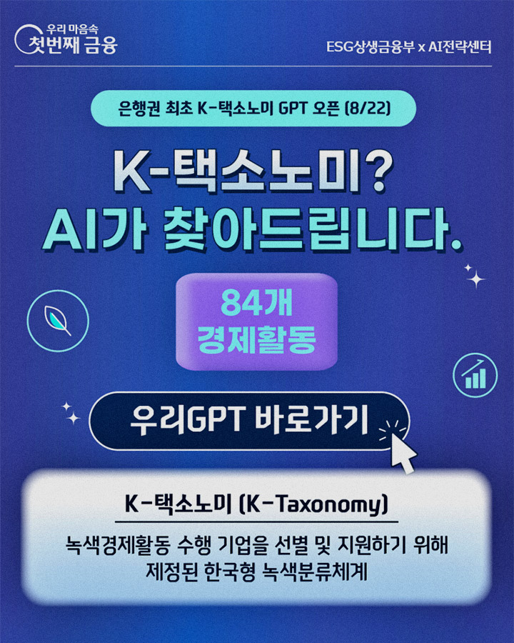 우리은행은 시중은행 최초로 한국형 녹색분류체계를 여신 심사에 활용하는 ‘K-택소노미 전문 상담 AI’를 도입했다고 밝혔다. K-택소노미(한국형 녹색분류체계)는 2021년 환경부가 제정한 녹색분류체계로, 온실가스 감축·자원순환 등 기업 활동이 환경목표 달성에 얼마나 기여하는지 판단하는 데 활용된다. 금융당국은 지난해 ‘녹색여신관리지침’을 발표하며, 금융권 녹색여신 심사에 반영하도록 권고한 바 있다. 우리은행은 이번 AI시스템에 LLM(대규모 언어모델)과 최신형 RAG(Retrieval-augmented Generation/검색 기반으로 정확한 응답을 생성하는 하이브리드 AI 방식) 기술을 적용해 ‘K-택소노미 전문 상담 AI’를 독자 개발했다. 사용자가 핵심 키워드를 입력하면 K-택소노미 대상 여부를 즉시 확인할 수 있으며, 높은 정확도를 기반으로 여신상담 활용도를 높였다.