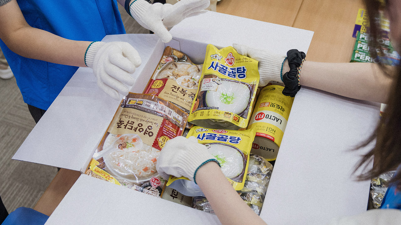 오늘만큼은 봉사자로 명명된 이들이 힘차게 ‘우리 모두, 우리’를 외치자 포장 작업이 시작됐다. 패키징 방식도 협업의 의미를 담았다. 테이블 당 8명의 봉사자가 모여 각자 맡은 역할을 해내면서 하나의 상자를 완성하는 과정으로 진행된 것. 물품들을 차곡차곡 쌓고 완벽한 밀봉 작업까지, 한마음 한뜻으로 손길을 더했다. “옆을 조심하세요!”, “장갑을 꼭 착용하세요.”, “상자가 이동합니다. 잠깐 비켜주세요.” 등등 서로의 안전을 챙기며 결속력 있게 합을 이뤄갔다. 분주한 움직임 속에 어느덧 여러 개의 상자가 쌓였다. 상자는 명절이 오기 전, 전국 조손가정에 하나씩 전달될 예정이다.