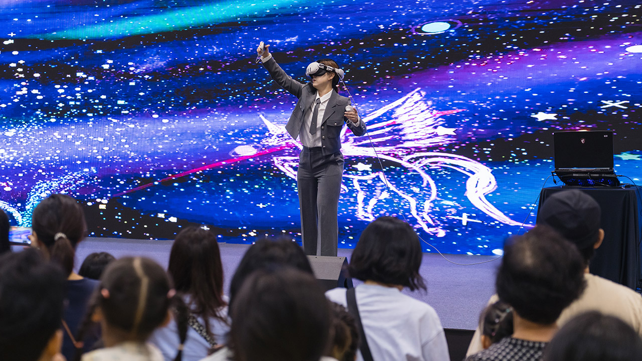 막이 오름과 동시에 시제 발표를 듣기 위해 무대 앞으로 모인 참가자들과 그 가족들의 시선을 빼앗은 퍼포먼스가 있었으니···! 그것은 바로 ‘VR 드로잉 퍼포먼스’다. 메타버스 아티스트 피오니 작가가 무대에 올라 가상의 VR을 이용해 그림을 그리고, ‘상상 한켠을 가득 채워요’, ‘작은 상상들이 모여 큰 의미를 이룬다’라는 문구로 참가자들에게 응원을 더했다. 참가자들은 실시간으로 자신들의 모습이 무대 화면에 나오며 그림과 어우러지자 힘찬 박수로 화답했다.