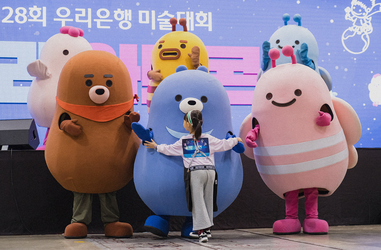 접수처에서 접수를 마친 참가자들은 각자 자리에 도구를 세팅하고, 막간을 이용해 위비프렌즈와 사진을 찍는 포토타임을 즐겼다. 그리고 오전 10시, 우리은행 조영주 아나운서의 안내를 시작으로 제28회 우리 아트콘의 막이 올랐다.