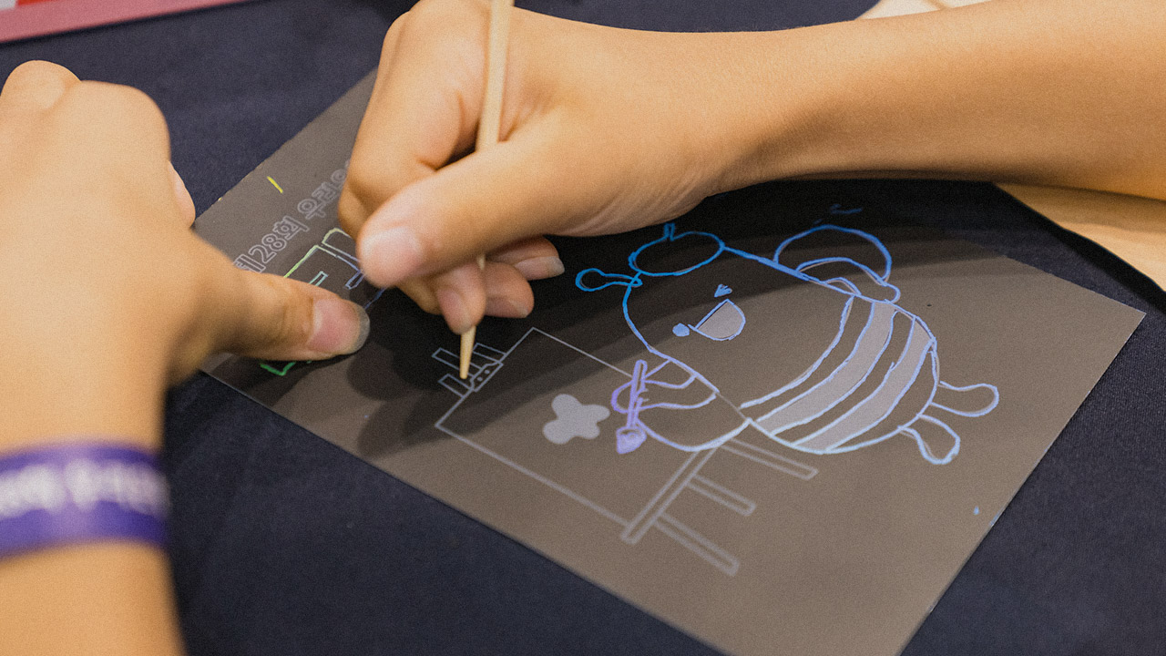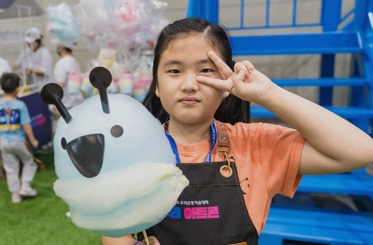 이번 우리 아트콘에서 주목할 만한 게 또 있다. 바로 다양한 체험이 가능한 체험 부스! 우리은행이 참가자들과 가족이 함께 즐길 수 있는 쿠의 반짝반짝 키링공방, 봄봄의 스크래치 아트, 두지의 우리 가족 캐리커처, 푸딩의 형광 밤하늘, 달보의 수제쿠키 등 미술과 연계된 부대 프로그램을 마련한 것이다. 각 프로그램을 완료하면, 위비프렌즈 스티커를 받아 카드를 채울 수 있어 즐거움을 최고치로 끌어올렸다. 그뿐만 아니라 우리 가족 라운지, 우리 달콤 아이스크림, 우리 상상 카페에서 간식을 이용할 수 있도록 했다.