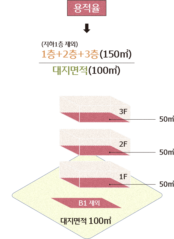 대지면적 가운데 연면적(각 층의 면적을 더한 면적)을 말한다. 땅 크기에 비해 건물을 전체 몇 평까지 지을 수 있는지를 보여주는 수치로, 층수를 올리면 연면적이 커져 용적률이 올라간다. 용적률을 산정할 때는 지하층의 면적, 지상층의 주차용으로 쓰는 면적, 주민공동시설의 면적, 피난안전구역의 면적은 제외한다.