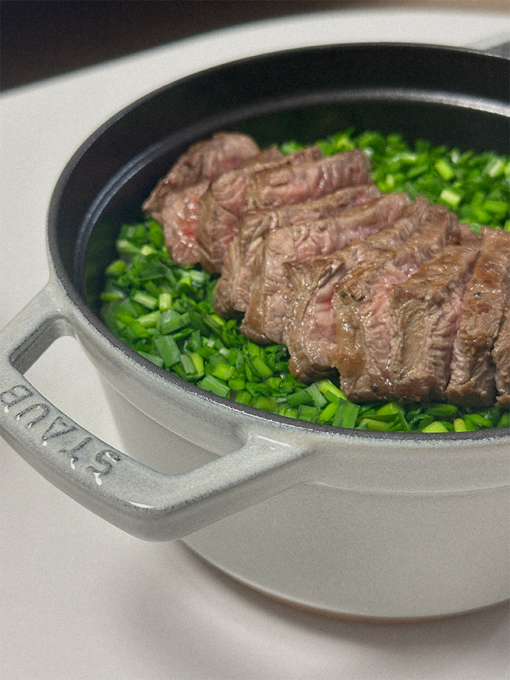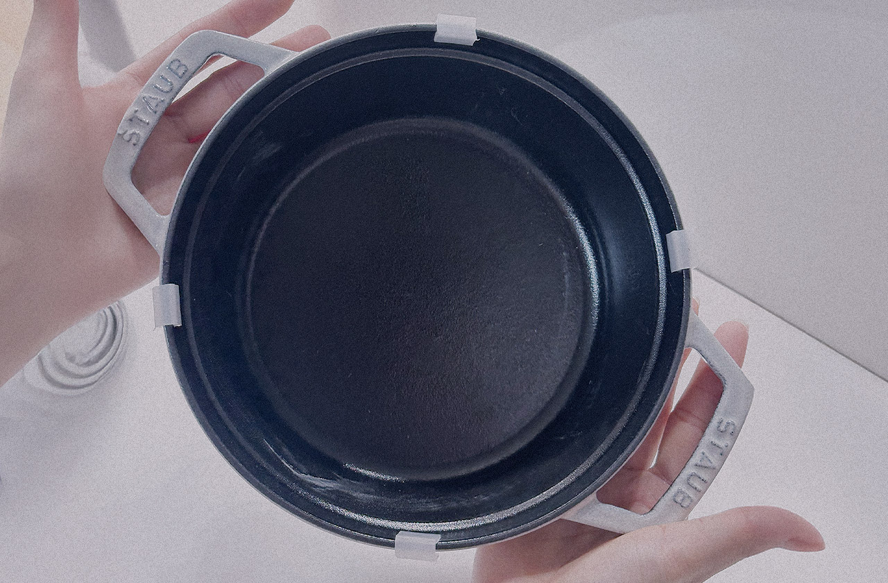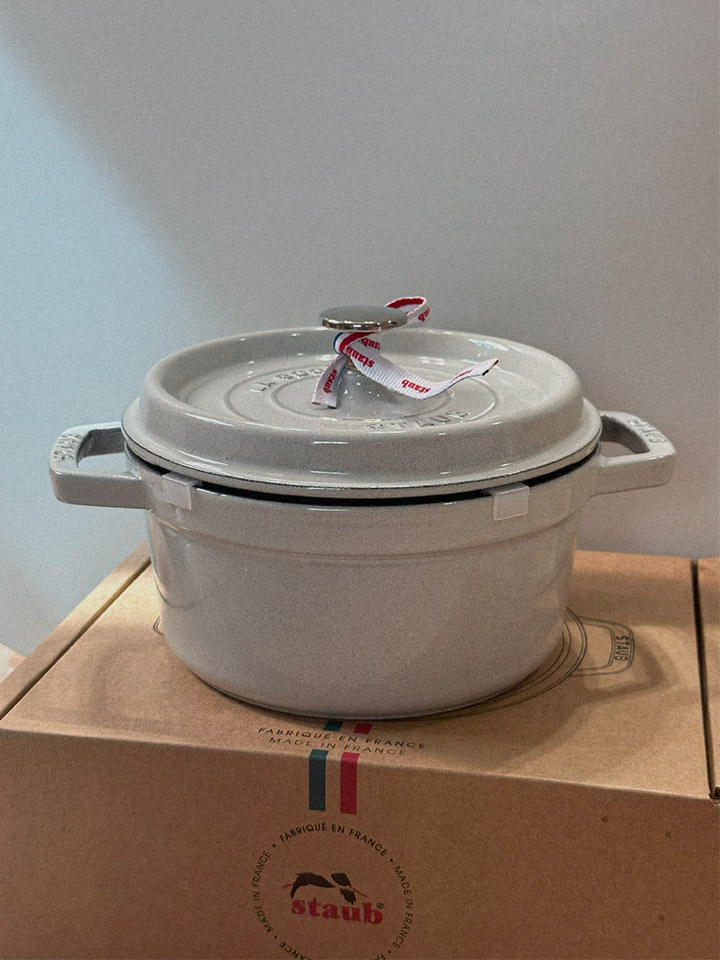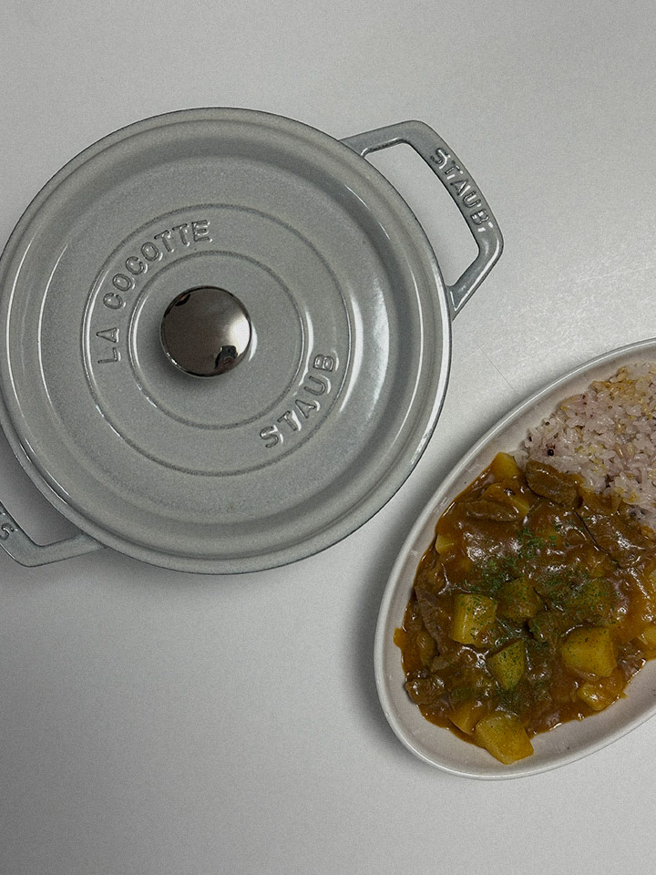 뚜껑 안쪽의 작은 돌기들은 마치 비 오는 날 창가에 맺힌 물방울처럼 음식 위로 촉촉이 떨어지며 수분을 지켜내줘요. ㅎㅎ 그래서인지 꼬꼬떼를 이용해 만든 밥은 촉촉했습니다. 한 번 써보니 전기밥솥이나 스테인레스 냄비와는 비교하기 어려운 깊이가 있다는 걸 인정하게 되더라고요. 물론 단점도 명확합니다. 한 손으로 들기 힘들 정도의 무게는 근력을 키워주고, 세심한 관리를 요합니다. 그러나 아이러니하게도 이 불편함이 오히려 스타우브의 매력을 배가 시키는 것 같아요! 귀찮지만(?) 애착이 생긴답니다. 스타우브 꼬꼬떼는 테이블 위에 올려두면 그 자체로 오브제가 되고, 매 식사 시간을 인스타 감성으로 만들어 줘요. 맛과 분위기 모두를 잡을 수 있는 ‘나만의 클래식’으로 오래오래 함께하고 싶은 냄비입니다!