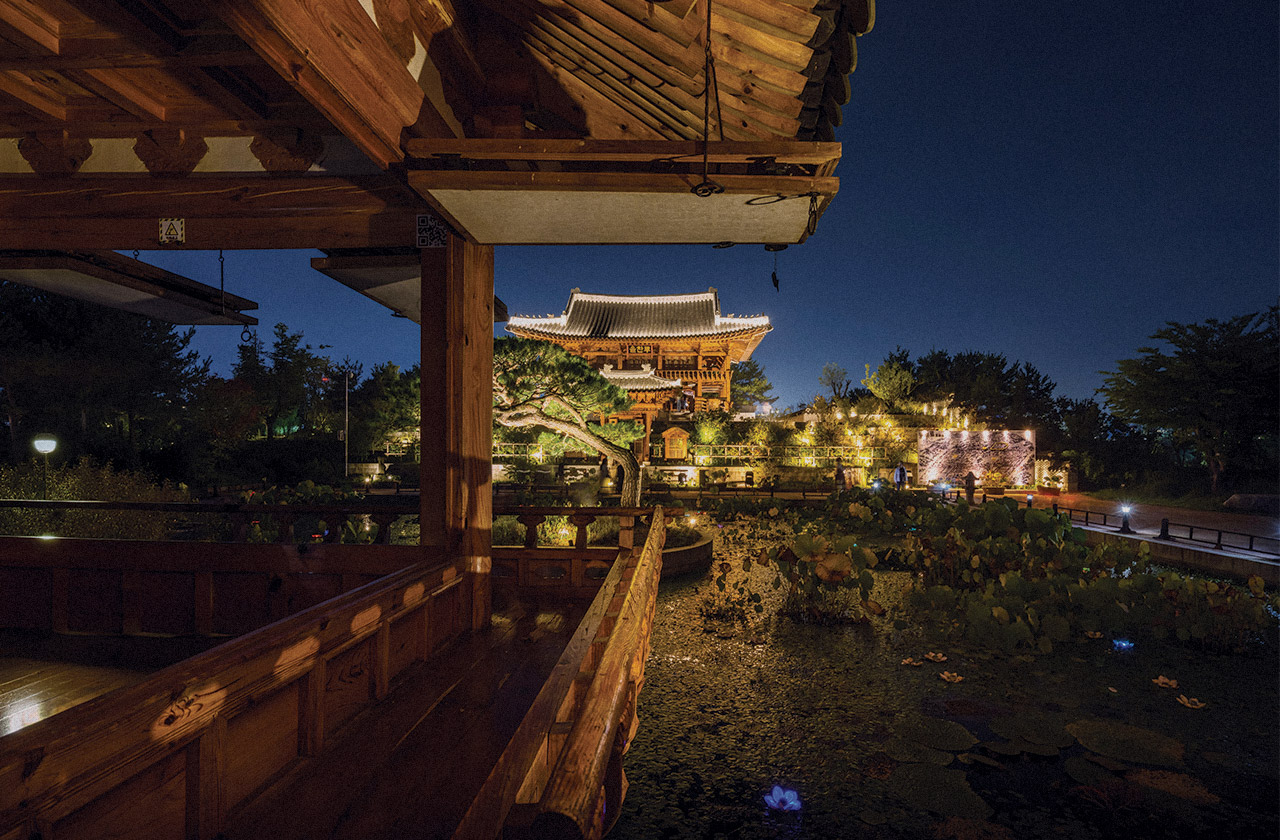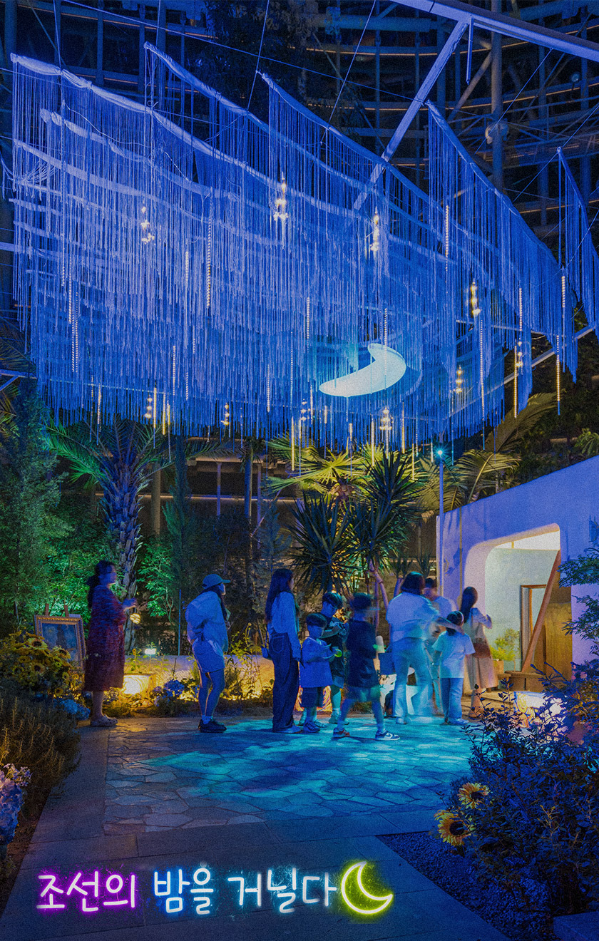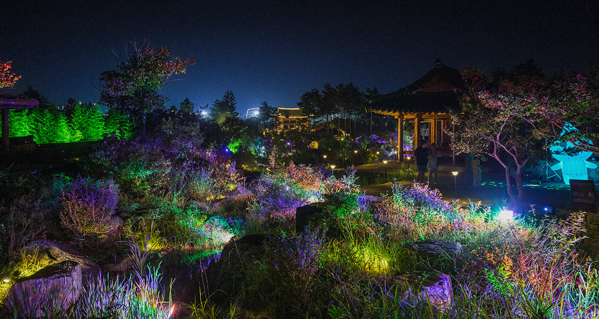 국립세종수목원의 야간개장에서 주목할 공간은 한국전통정원. 한국전통정원은 궁궐정원, 별서정원, 민가정원으로 이루어져 있는데 솔찬루가 있는 궁궐정원은 창덕궁 주합루와 부용정을 실제 크기로 조성했다. 어둠이 내려앉은 저녁에 환하게 빛나는 솔찬루 덕분에 궁궐정원까지 찾아가는 길은 어렵지 않다. 세종수목원의 야간개장 시즌이면 무료 한복 대여도 하는데, 한복을 맞춰 입고 솔찬루 주변을 걸어보자. 마치 옛 궁을 거니는 느낌이 든다. 그러다가 솔찬루 정상 마루에 앉아 국립세종수목원의 야경을 눈에 담아도 좋다. 초록빛 자연이 잠든 사이로 빛나는 불빛들이 오묘한 느낌을 자아낸다. 어떤 설명을 덧붙이지 않아도 국립세종수목원의 밤이 아름다운 이유를 잘 알려주는 풍경이다. 그러니 긴 밤을 조금 더 특별하게 만들어 보고 싶다면 다음 해에도 계속될 국립세종수목원의 야간개장 시기를 기다려보자. 올해는 아쉽게 끝이 났지만, 봄부터 이른 가을까지 긴 시간 동안 자연 속에서 불을 켜고 우리를 반겨줄 것이다.