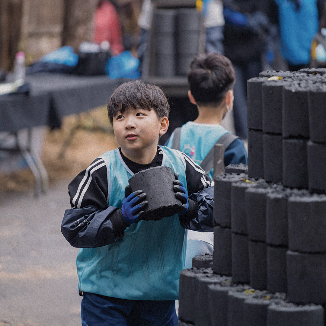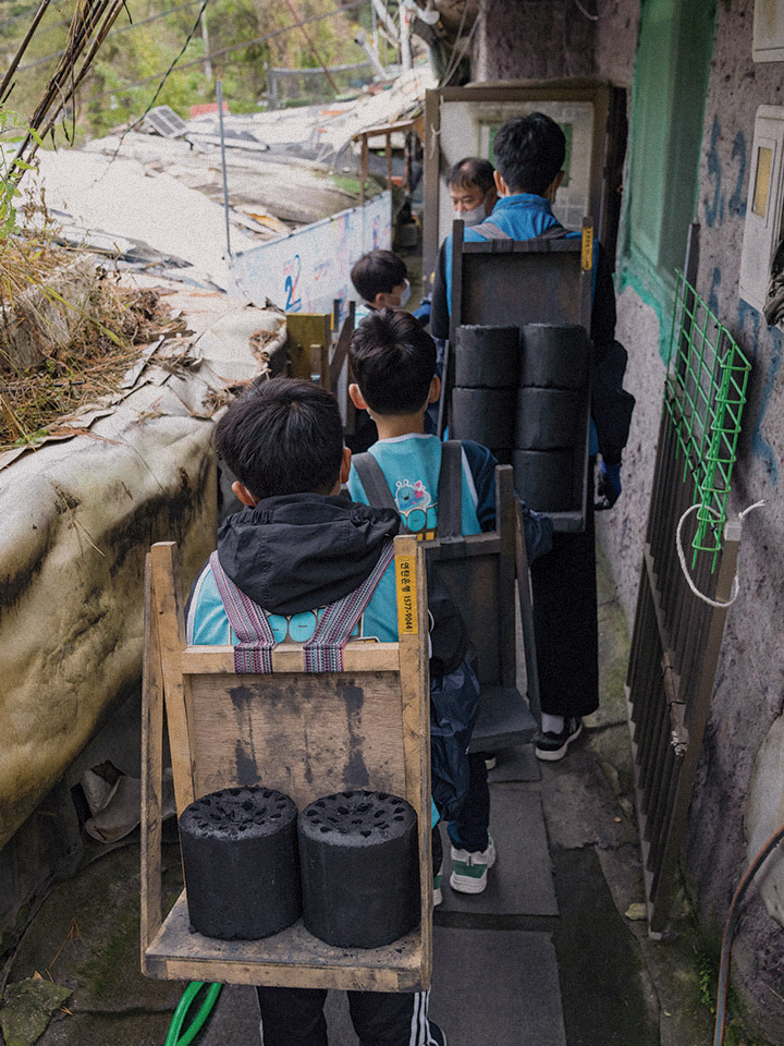 가족들이 손을 잡고 골목길을 따라 마을 깊숙이 들어섰다. 길 한쪽 끝에 연탄 3,500장이 수북이 쌓였고, 봉사단원들은 저마다 지게와 장갑을 착용하고 만반의 준비를 마쳤다. 이번 봉사는 이동과 적재 역할로 나눠서 진행된다. “무엇보다 안전이 중요합니다. 다치지 않도록 활동을 잘 마무리하시길 바랍니다.” 지게에 연탄을 가득 싣고 집과 골목 사이를 분주히 이동하기 시작한다. 몇몇 단원들은 연탄 창고 앞에서 긴 줄을 만들었다. “하나, 둘, 셋···” 손에서 손으로 연탄이 옮겨지면서 모두의 손길이 바빠진다.