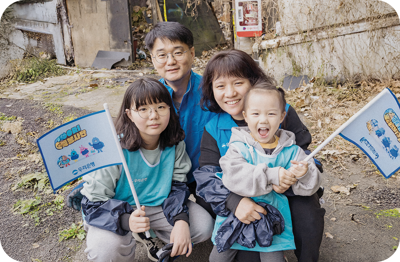 WOORI 가족봉사단은 우리은행 임직원과 가족이 함께 이웃을 돕는 대표 봉사 프로그램이다. 매년 초에 모집해 총 100여 명의 봉사단을 선발하고 있다. 단원들에게 봉사활동의 기회는 물론 봉사를 완료할 때마다 위비프렌즈 지비츠와 봉사활동 회차별 선물이 제공된다. 올해 역시 다양한 테마의 봉사활동이 진행됐다. 아동, 장애인, 노인 등 대상자를 달리하는가 하면 환경 이슈에 관심을 기울이며 플로깅에도 동참했다. 브랜드전략부 이민하 대리는 WOORI 가족봉사단의 특징으로 ‘지속성’과 ‘연결’을 손꼽았다.