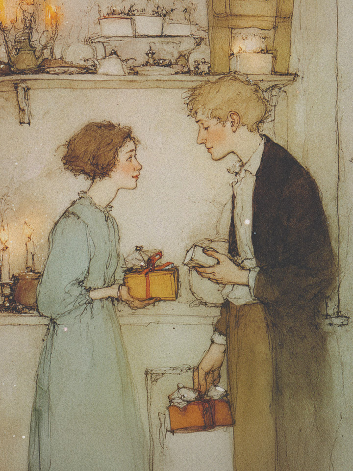 세 번째 이야기는 작가 오 헨리의 <크리스마스 선물>이다. 가난한 부부 델라와 짐은 서로에게 크리스마스 선물을 주기 위해 각자 가장 소중한 것을 희생한다. 델라는 자신의 아름다운 긴 머리카락을 팔아 짐의 금시계에 딱 어울리는 아름다운 체인을 산다. 짐은 그것도 모른 채 자신의 소중한 금시계를 팔아 델라의 눈부신 머리카락을 장식할 어여쁜 빗을 산다. 비록 머리카락은 잘려 나갔고 시계는 사라져서 선물은 사용 불가능한 상태가 되었지만, 그 물건에 깃든 사랑의 힘은 어느 때보다 강력해지지 않았을까. 빗을 쥘 때 델라는 짐의 인생을 만지는 것이며, 시곗줄을 볼 때 짐은 델라의 분신을 보는 것이다. 이제 그들은 떼려야 뗄 수 없는 하나의 존재, 더 큰 사랑으로 미래를 견뎌낼 수 있는 아름다운 존재들이 된 것이다. 이런 나눔, 이런 사랑, 이런 따스함이 있다면, 우리는 한겨울의 추위는 물론 세상의 어떤 어려움도 견뎌낼 수 있는 무적의 힘을 얻을 수 있지 않을까.