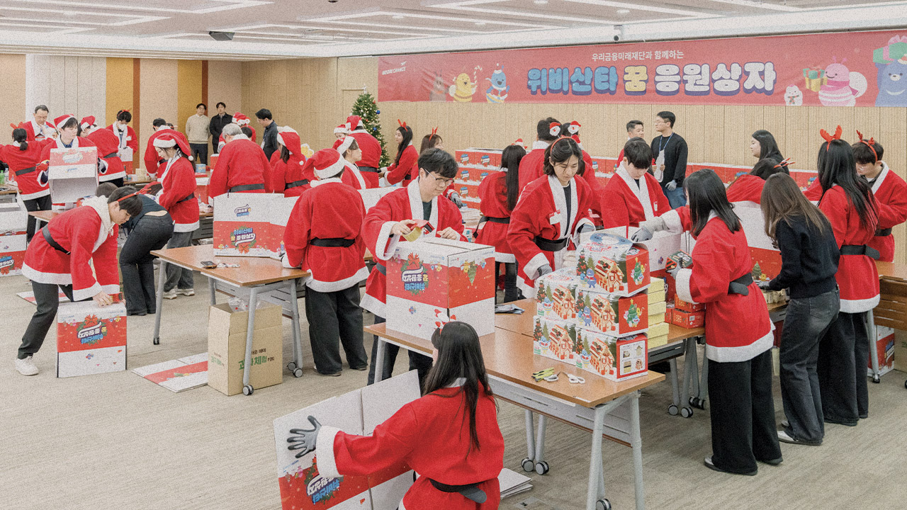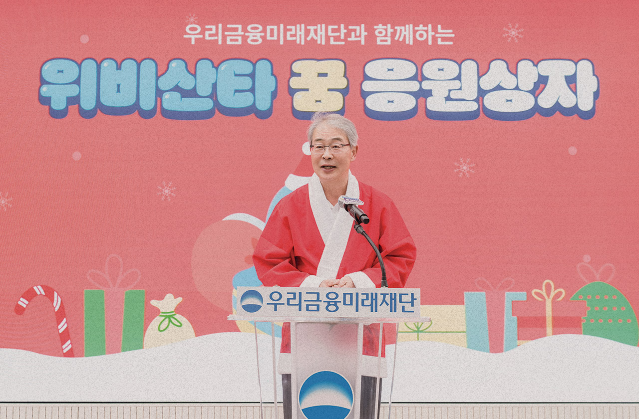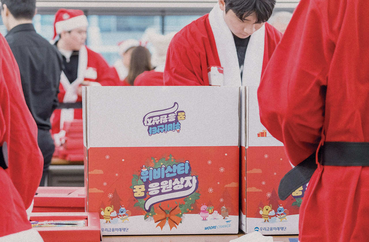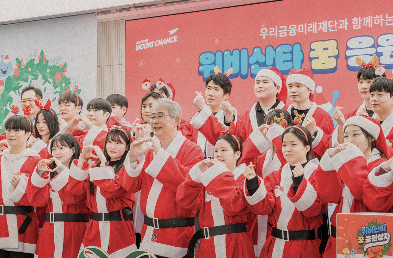 드디어 모든 선물 포장이 마무리되고, 출정식이 이어졌다. “위비산타! 출발!” 봉사자들이 모두 무대에 올라 구호를 외쳤다. 보호아동에게 따뜻한 크리스마스로 기억되길 바라는 마음을 담아 보육원으로 향한 위비산타들, 선물을 한 아름 안은 이들의 발걸음에 힘찬 기운이 실렸다. 경제적·문화적 불평등으로 인한 성장의 한계를 극복하고, 모두가 행복한 사회를 만들어 온 우리금융미래재단의 행보는 계속될 것이다. “2026년 우리금융미래재단은 발달장애, 미래세대, 우리 히어로, 취약계층 등 4대 영역을 중심으로 지속적인 지원을 이어갈 계획입니다. 더불어 우리금융그룹 임직원과 함께 봉사활동을 할 수 있는 나눔의 기회를 확대할 예정인데요. 앞으로도 오늘보다 더 따뜻한 ‘내일’을 만드는 데 힘을 보태겠습니다!” 새해에도 세상 곳곳에 온기를 전달하고, 어두운 곳을 밝게 비추는 이들의 새로운 출발을 응원한다.
