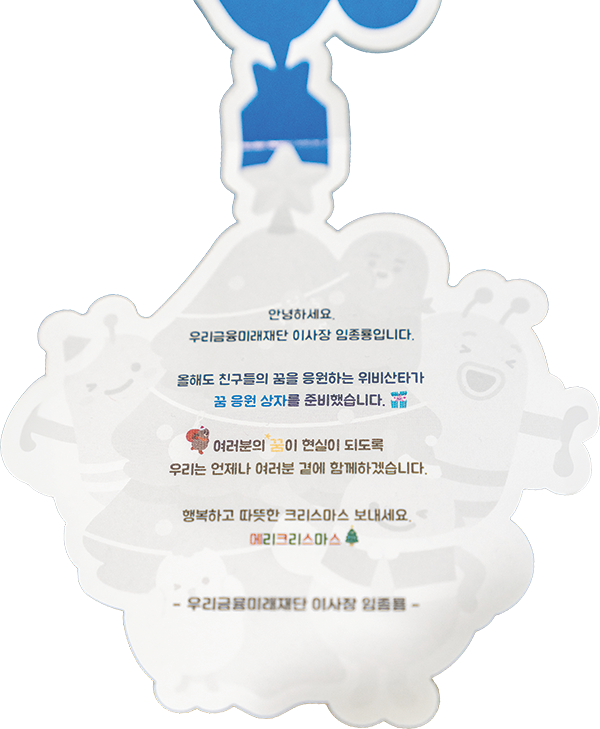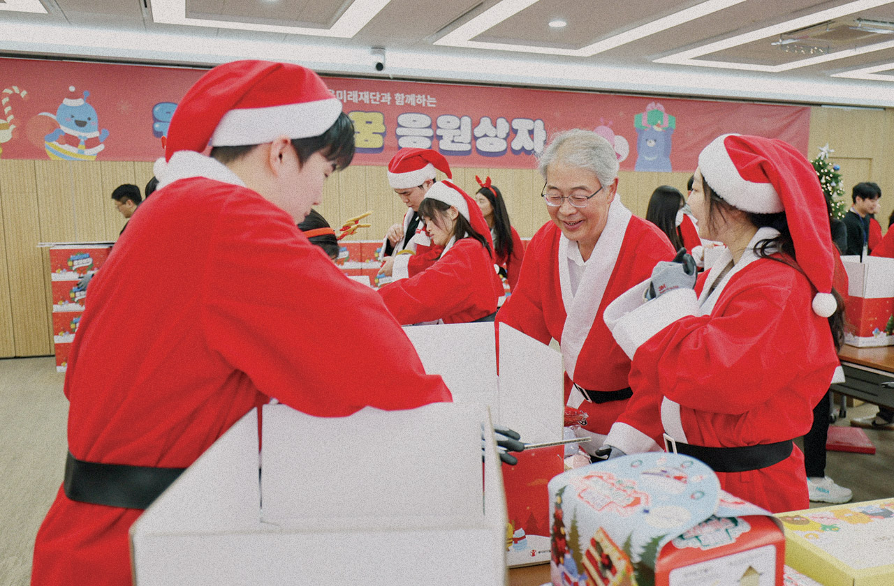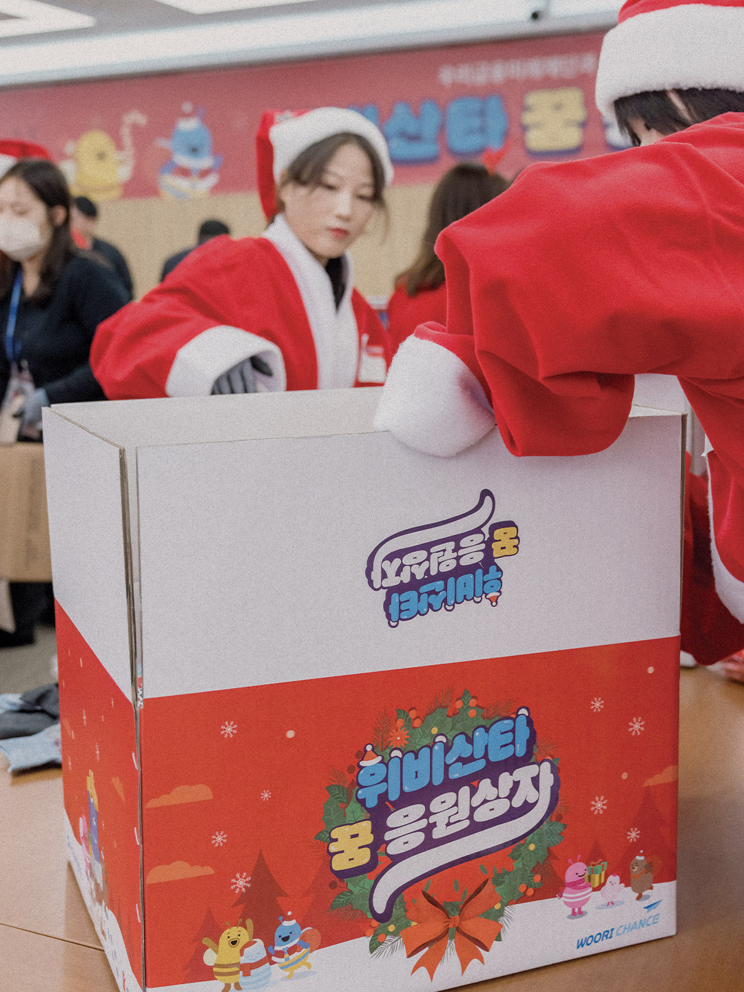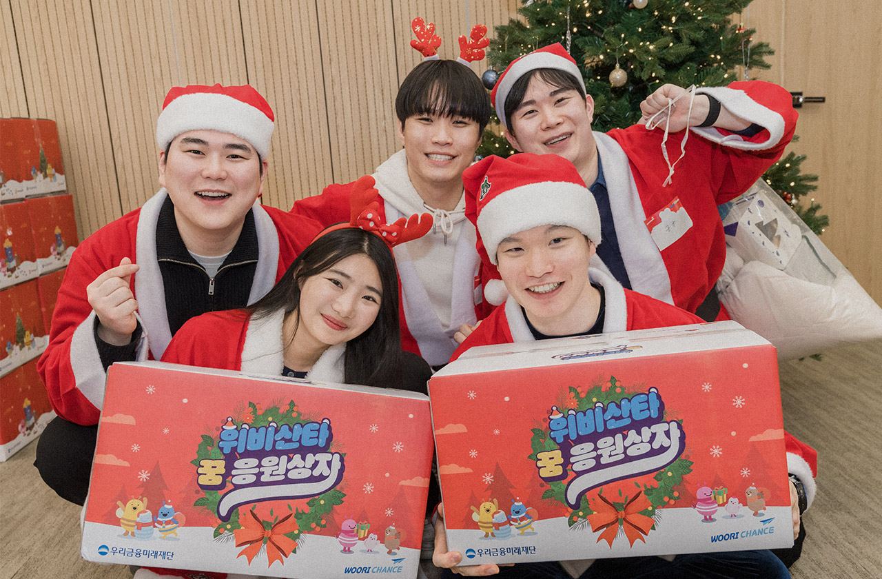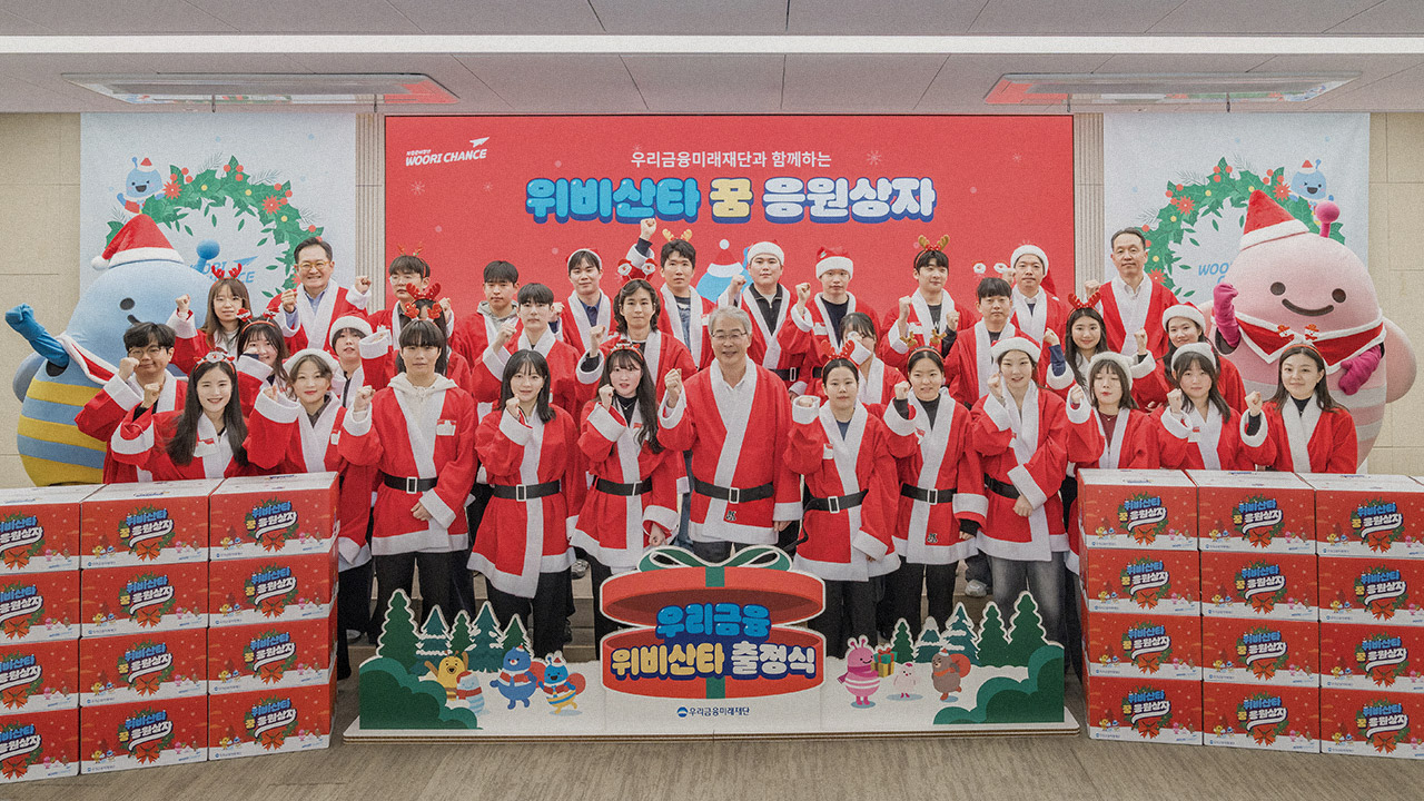 드디어 모든 선물 포장이 마무리되고, 출정식이 이어졌다. “위비산타! 출발!” 봉사자들이 모두 무대에 올라 구호를 외쳤다. 보호아동에게 따뜻한 크리스마스로 기억되길 바라는 마음을 담아 보육원으로 향한 위비산타들, 선물을 한 아름 안은 이들의 발걸음에 힘찬 기운이 실렸다. 경제적·문화적 불평등으로 인한 성장의 한계를 극복하고, 모두가 행복한 사회를 만들어 온 우리금융미래재단의 행보는 계속될 것이다. “2026년 우리금융미래재단은 발달장애, 미래세대, 우리 히어로, 취약계층 등 4대 영역을 중심으로 지속적인 지원을 이어갈 계획입니다. 더불어 우리금융그룹 임직원과 함께 봉사활동을 할 수 있는 나눔의 기회를 확대할 예정인데요. 앞으로도 오늘보다 더 따뜻한 ‘내일’을 만드는 데 힘을 보태겠습니다!” 새해에도 세상 곳곳에 온기를 전달하고, 어두운 곳을 밝게 비추는 이들의 새로운 출발을 응원한다.