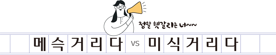 한 대리는 부서 내에서 자칭 타칭 쩝쩝박사입니다. 신상 간식도 많이 알고, 지역별 맛집도 꿰뚫고 있을뿐더러 점심시간이 되면 메뉴 고민을 덜어주거든요. 하지만 웬일인지 점심시간이 다 되어가는데도 한 대리의 메뉴 정하기 시간이 올라오지 않아서 부서 사람들은 궁금해졌습니다. 메신저에 한 대리의 안부를 묻기 시작했죠. “한 대리 오늘 점심 뭐 먹지?”, “대리님이 웬일이래요. 점심 메뉴 정하기 타임도 잊고···.” 메신저 알림이 띠링, 띠링 울려대자 한 대리는 그제서야 답을 했습니다. “윽 ㅠㅠ. 저 속이 미식거려서, 오늘 점심은 건너뛰어야 할 것 같아요.” 한 대리는 급한 마음에 답변을 했지만 하고 나서 아차 싶었습니다. ‘미식거리다가 아닌 것 같은데···.’