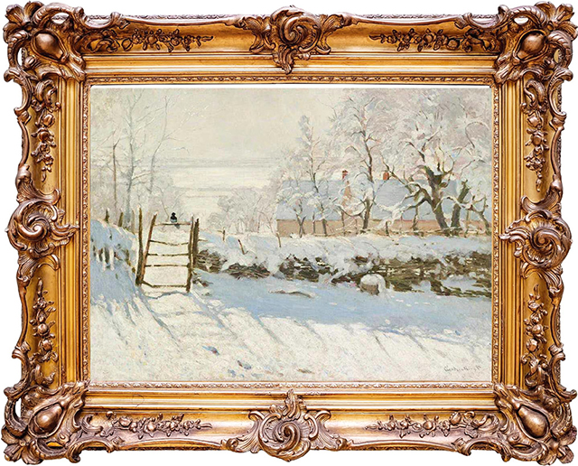 모네는 햇빛이 눈 위에 만드는 색채의 변화를 포착했다. 눈은 순백색이 아니다. 엷은 색조로 물들어 있고, 그림자가 드리운 곳에는 회색과 푸른색이 섞여 있다.