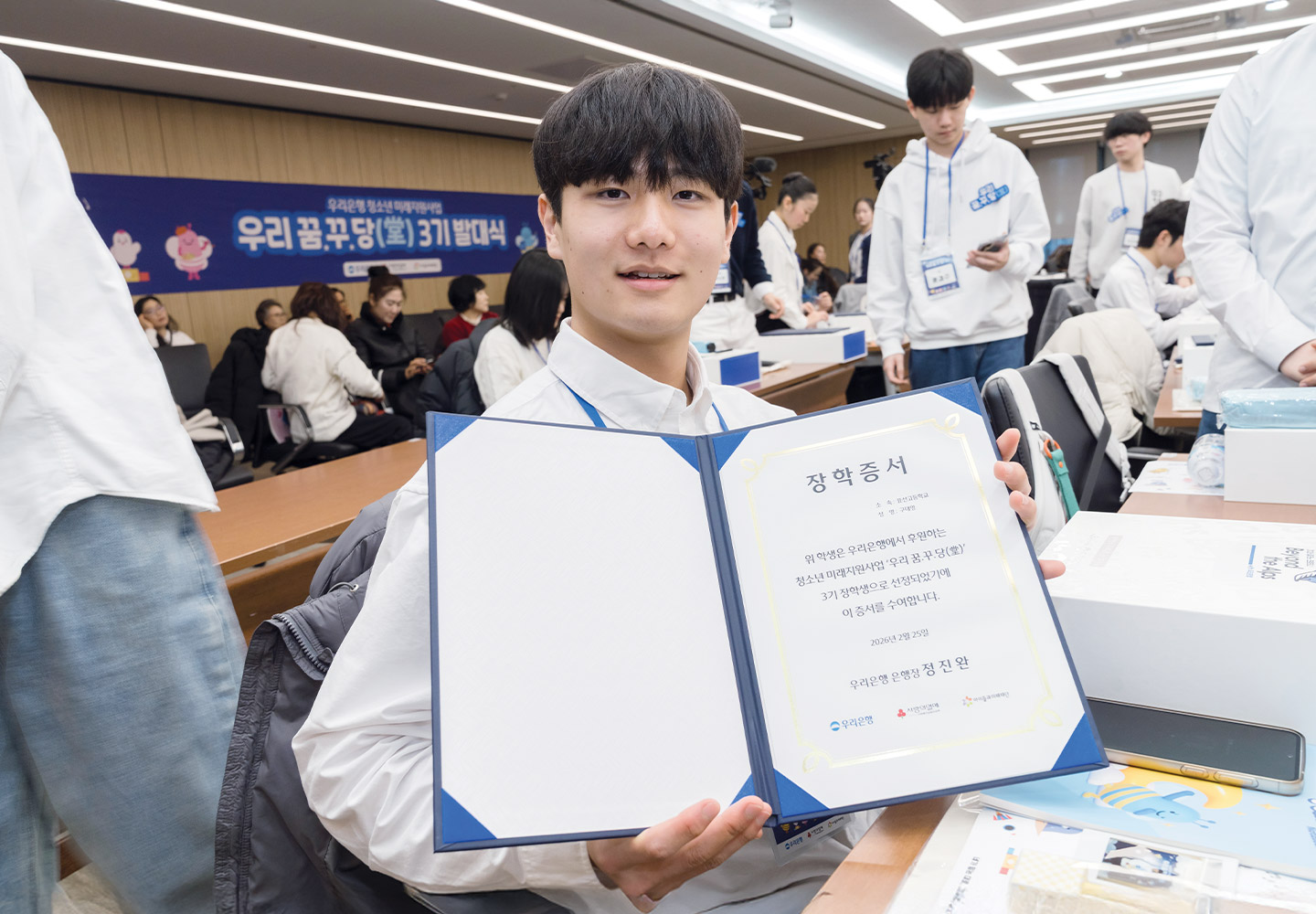 이어서 장학증서 수여식이 진행됐다. 정진완 은행장은 장학생 한 명 한 명과 눈을 맞추며 장학증서를 전달했다. 증서를 받은 장학생들의 얼굴에는 설렘과 당찬 포부가 묻어났으며, 현장은 이들의 격려하는 박수 소리로 가득 찼다. 이어지는 기념 촬영에서 모두가 한목소리로 “우리 꿈·꾸·당(堂) 3기 파이팅!”을 외치며 힘찬 첫걸음을 선포했다.